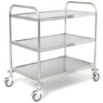 Chariot professionnel à 3 niveaux, idéal pour le transport et le service en restauration, réception ou cuisine traiteur. Structure robuste et maniable grâce à ses roues pivotantes.